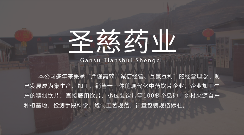 甘肅天水圣慈藥業(yè)有限公司成立于2016年11月8日,注冊資本500萬元,位于甘肅省天水市張川回族自治縣張川鎮(zhèn)中城南路,本公司多年秉承“嚴謹高效、誠信經營、互贏互利”的經營理念,現已發(fā)展成為集生產、加工、銷售于一體的現代化中藥飲片企業(yè)。企業(yè)加工生產的精制飲片、直接服用飲片、小包裝飲片等100多個品種,藥材來源自產種植基地、檢測手段科學、炮制工藝規(guī)范、計量包裝規(guī)格標準。